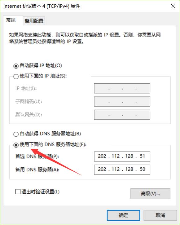 7.选中“使用下面的DNS服务器地址”,并修改DNS为学校DNS服务器:202.112.128.51、202.112.128.50